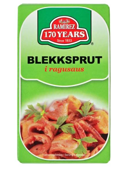 Calamares (blekksprut (Dosidius spp)) 55%, saus 45% (solsikkeolje, løk, tomat 8%,